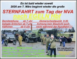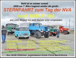 Es ist 2026, die Tage werden länger, etwas wärmer und die ersten Treffen stehen an. Der Auftakt der Saison war wie immer die „Ausfahrt zum Tag der NVA“ in Egeln. Sie fiel in diesem Jahr auf den 7. März, denn der erste war ein Sonntag, und so fuhren wir mit unserer „NVA-Flotte“ dort hin. Mit von der Partie war neben W50, ELLO, P3 und Trabant Kübel auch der UAZ eines Bekannten. Dies ist auch in anderer Hinsicht ein Ereignis, denn nach der Winterpause ist doch eine intensivere Vorbereitung der Fahrzeuge angebracht. So trafen sich alle, um gemeinsam alles vorzubereiten.