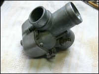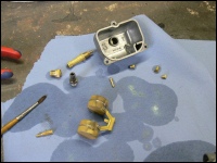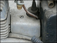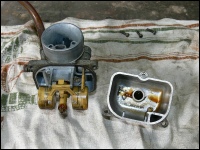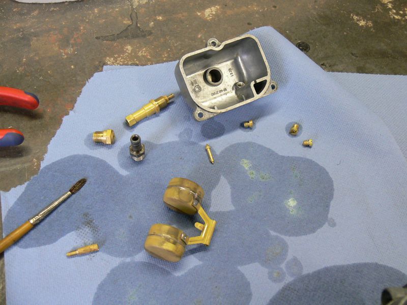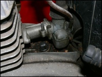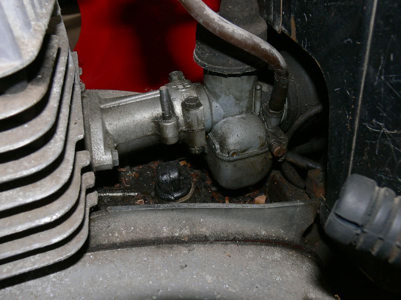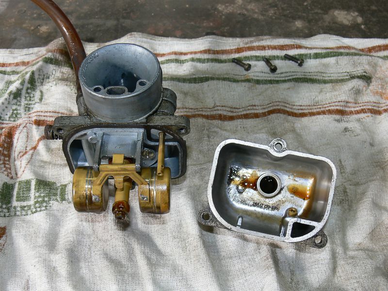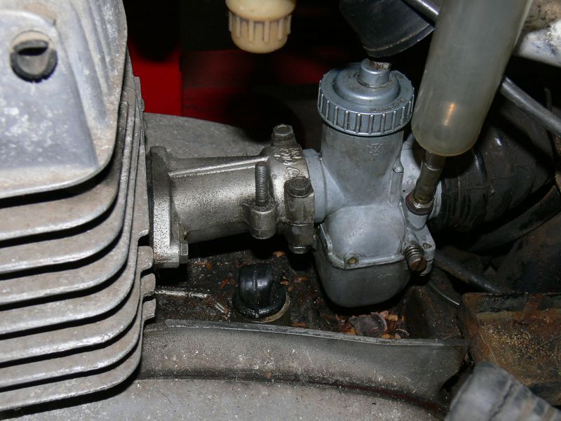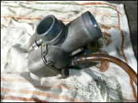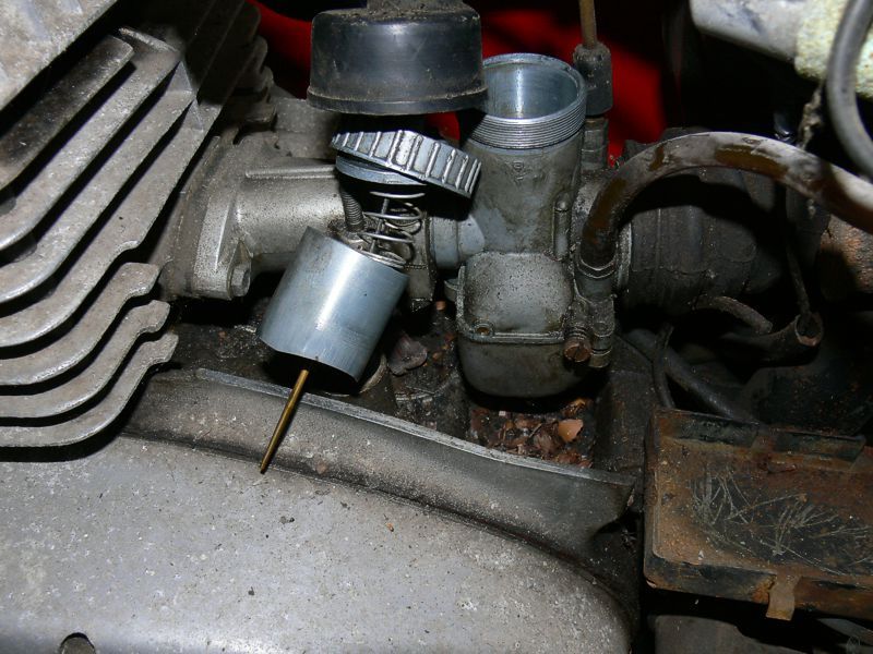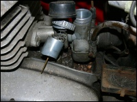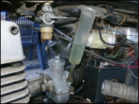 Wir bauten den Vergaser ab, um zu sehen, ob der innen genauso versifft und oxydiert war wie der Tank. Doch die Überraschung war groß, denn er war, bis auf einige kleine Öl- bzw. Additivreste, sauber. Nach einem Bad der Teile im Vergaserreiniger und der Überprüfung der Düsen, schraubten wir ihn wieder zusammen und an den Motor. Da der Tank und dessen Inhalt nicht mehr zu gebrauchen war, behalfen wir uns mit dem schon öfter benutzten „Ersatztank“. Das war eine etwas größere Spritze mit einem Benzinschlauch dran. Diesen steckten wir auf den Vergaser und füllten Kraftstoff ein. Die Spritze war halb voll und das Schwimmernadelventil, auch immer so ein Problem beim Vergaser, tat seinen Dienst und stoppte die Zufuhr.