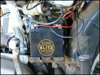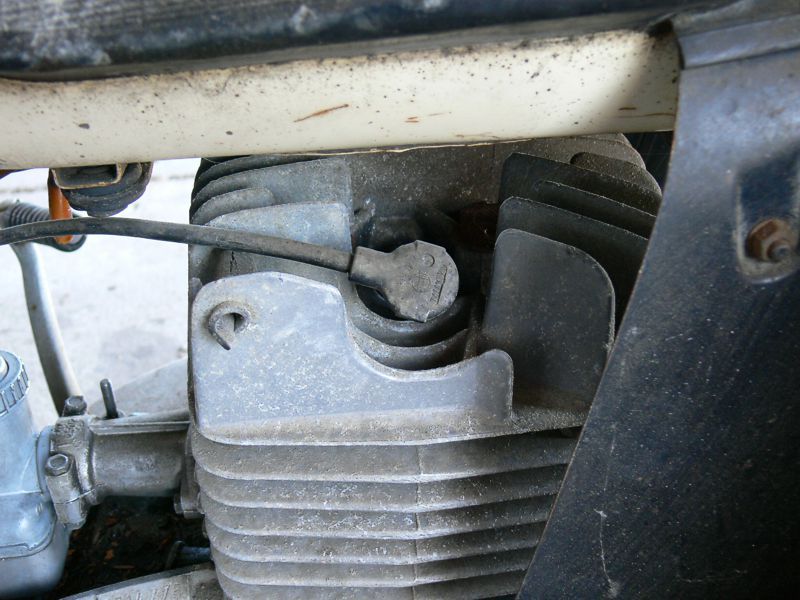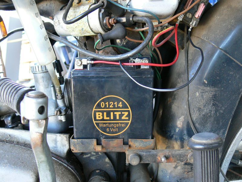 Als nächste brauchten wir noch einen Zündfunken. Dazu wurde aus der ersten ES die Batterie ausgebaut und hier angeschlossen. Zündung an (ging erst nach mehrmaligem hin und her bewegen des Zündschlüssels) die Kerze in den Kerzenstecke gesteckt, an Masse gehalten und den Kickstarter betätigt. Und …. kein Zündfunke. Da die Zündkerze nicht sehr vertrauenserweckend aussah, tauschten wir sie als erstes aus. Nächster Versuch - jetzt war ein Zündfunke da. Die Kerze konnte wieder reingeschraubt werden und wir hofften, dass die Zündung nicht verstellt war und funktionierte.
