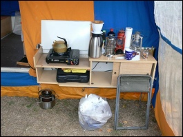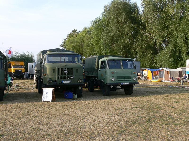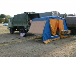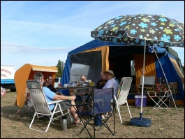 Sammstag früh 7 Uhr alle an der Halle getroffen und hin. Wir hatten Glück und bekamen noch den letzten Platz auf der Hauptwiese. So konnten wir unser Zelt, noch einigermassen günstig platziert, hinter unserem ELLO aufbauen. Der Trabant musste aber bei den anderen Pkw abgestellt werden. Vor uns und in Sichtweite. Da dieses mal Jürgen mit war, der auch mithalf den Trabant wieder in Gang zu bringen und auch vorher schon bei einen Probeaufbau des Klappfix mit gemacht hatte, ging der Aufbau doch recht zügig und ohne Stress von statten.